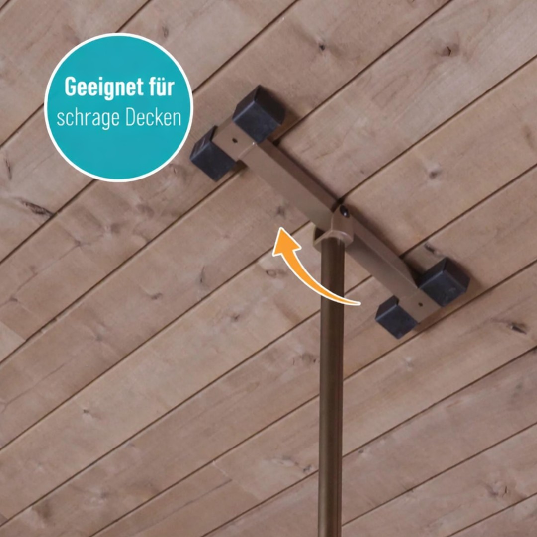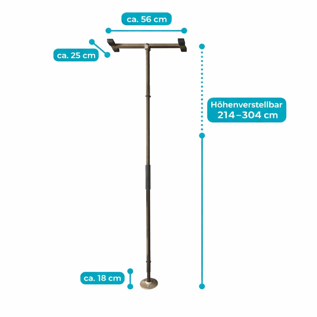 - Durch die feste Verspannung zwischen Boden und Decke entsteht ein stabiler Haltepunkt, an dem sich der Nutzer sicher hochziehen oder stabilisieren kann.