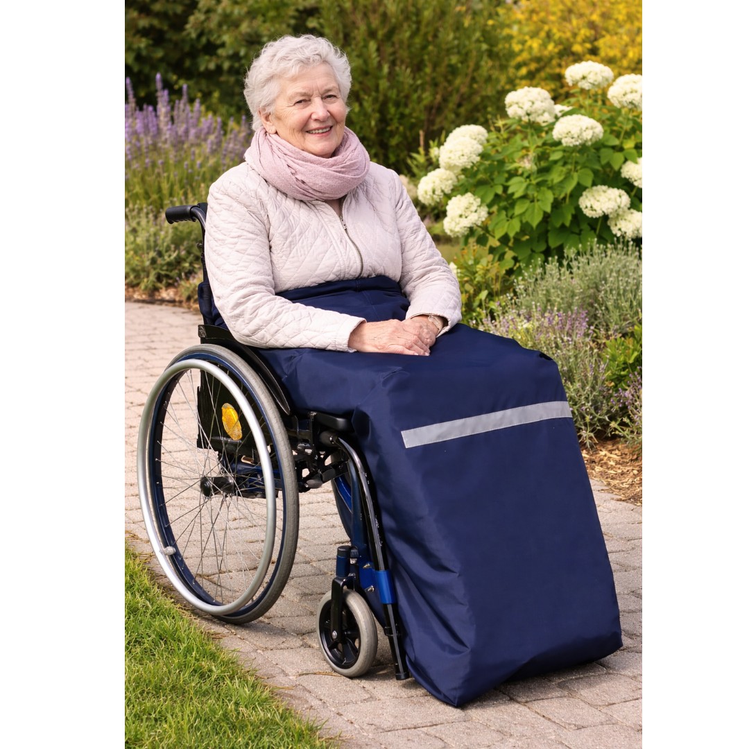 Die Orgaterm Beinschutzdecke Standard bietet zuverlässigen Schutz vor Kälte, Wind und Nässe und ist ideal für den Einsatz im Rollstuhl oder beim Sitzen im Freien. Das strapazierfähige Nylongewebe ist wasser- und winddicht, während die weiche Innenfütterung aus marinefarbenem Webpelz für angenehme Wärme und hohen Komfort sorgt.