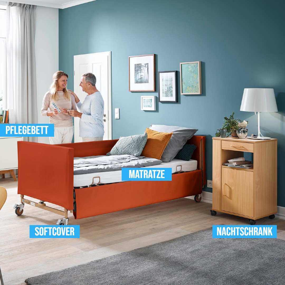 Set bestehend aus: Burmeier Dali Pflegebett 90 × 200, Softcover ornage, Pflegematratze Compact SingleCare, wahlweise SmileComfort, Nachtschrank Hermann