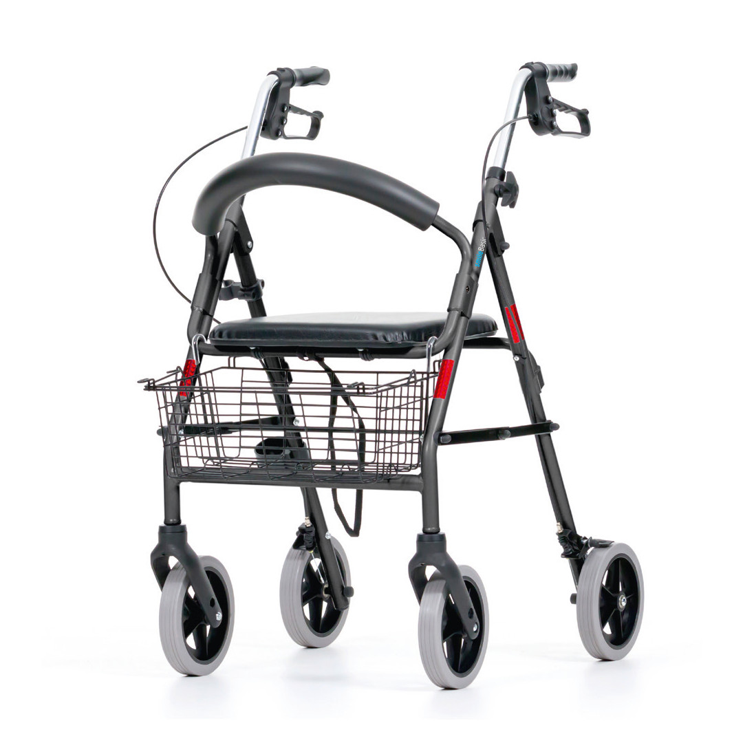 - Auch beim Komfort setzt der SmileBasic Pan klare Maßstäbe: Die gepolsterte Sitzfläche und die stabile Rückenlehne ermöglichen entspannte Pausen jederzeit. Die ergonomisch geformten, höhenverstellbaren Griffe lassen sich individuell auf Körpergrößen von 160 bis 195 cm anpassen und sorgen so für eine gesunde, aufrechte Haltung beim Gehen. Der integrierte Korb sowie der praktische Stockhalter machen den Rollator zu einem zuverlässigen Begleiter im Alltag, bei dem alles Wichtige stets griffbereit ist.