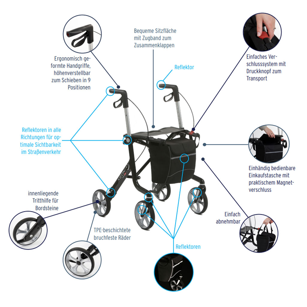 Der XEON wird bereits mit Einkaufstasche und Stockhalter geliefert. Mit der breiten Produktpalette an Zubehör lässt sich der Rollator auf Ihre Bedürfnisse anpassen.