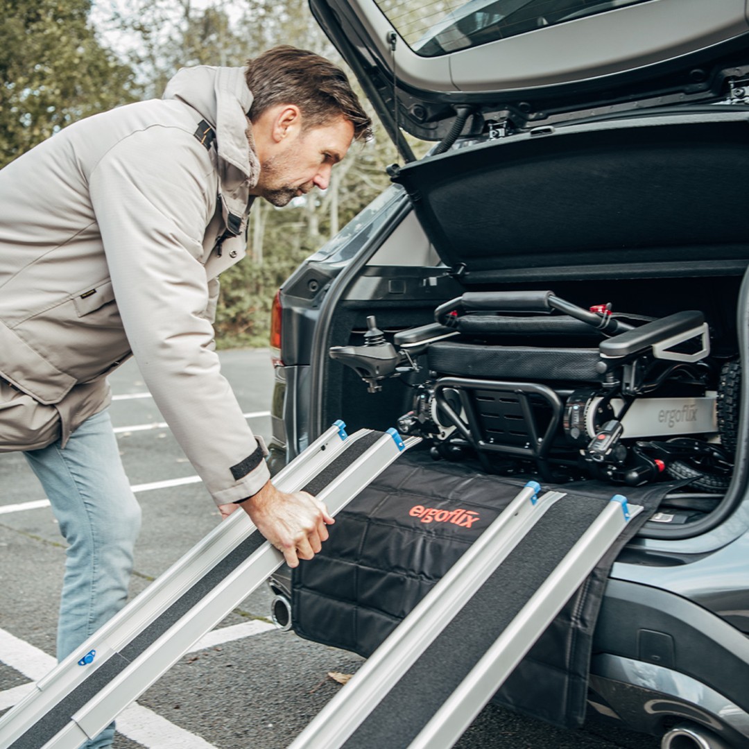 Mit Hilfe des 2-teiligen Rampenpaares können Sie Ihr ergoflix-Modell ganz bequem in fast jeden Kofferraum ein- und ausladen. Auch Treppenstufen sind mit dem Rampenset von ergoflix leicht zu überwinden. Die Teleskoprampen sind aus robustem Aluminium gefertigt und lassen sich leicht aus- und wieder einschieben. Dank geringem Gewicht und Schiebemechanismus ist so ein kompakter Transport gewährleistet.