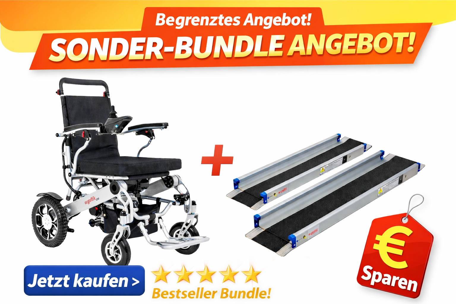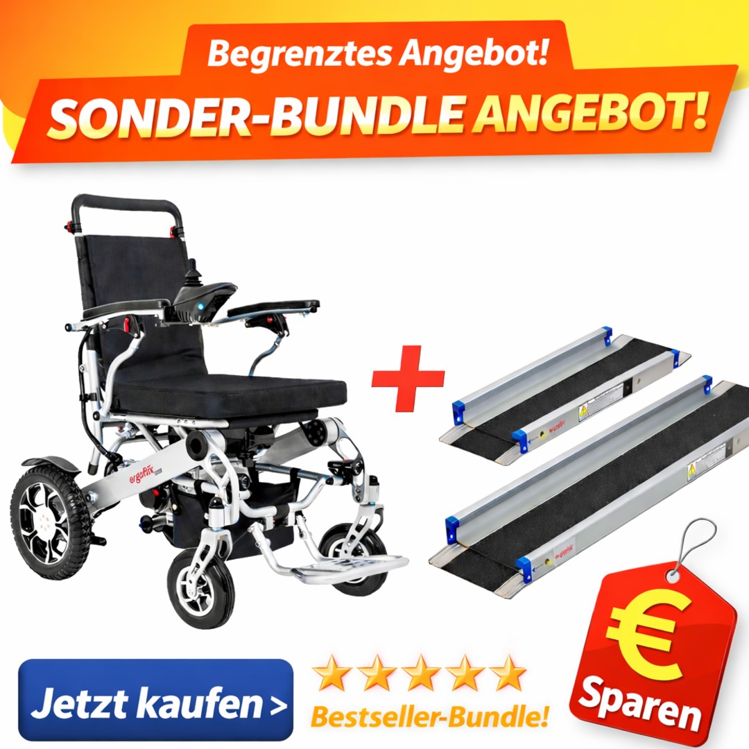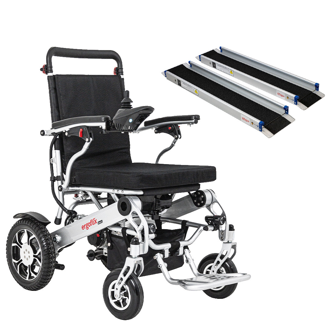 Ergoflix Basic Elektro-Rollstuhl, faltbar, Alu-Rollstuhl, für den Innen- und Außenbereich, mit gratis Teleskoprampe Luca (ID#1236837)