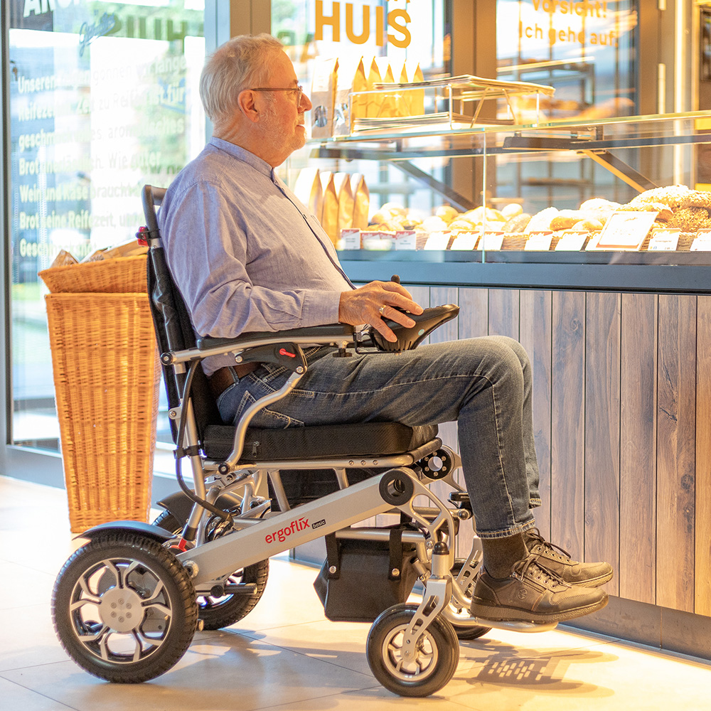 Der ergoflix basic ist ideal für Dich geeignet, wenn Du einen elektrischen Standardrollstuhl für den Alltag suchst. Dank des Faltmechanismus kannst Du Deinen Wegbegleiter mit nur einer Hand zusammenfalten.