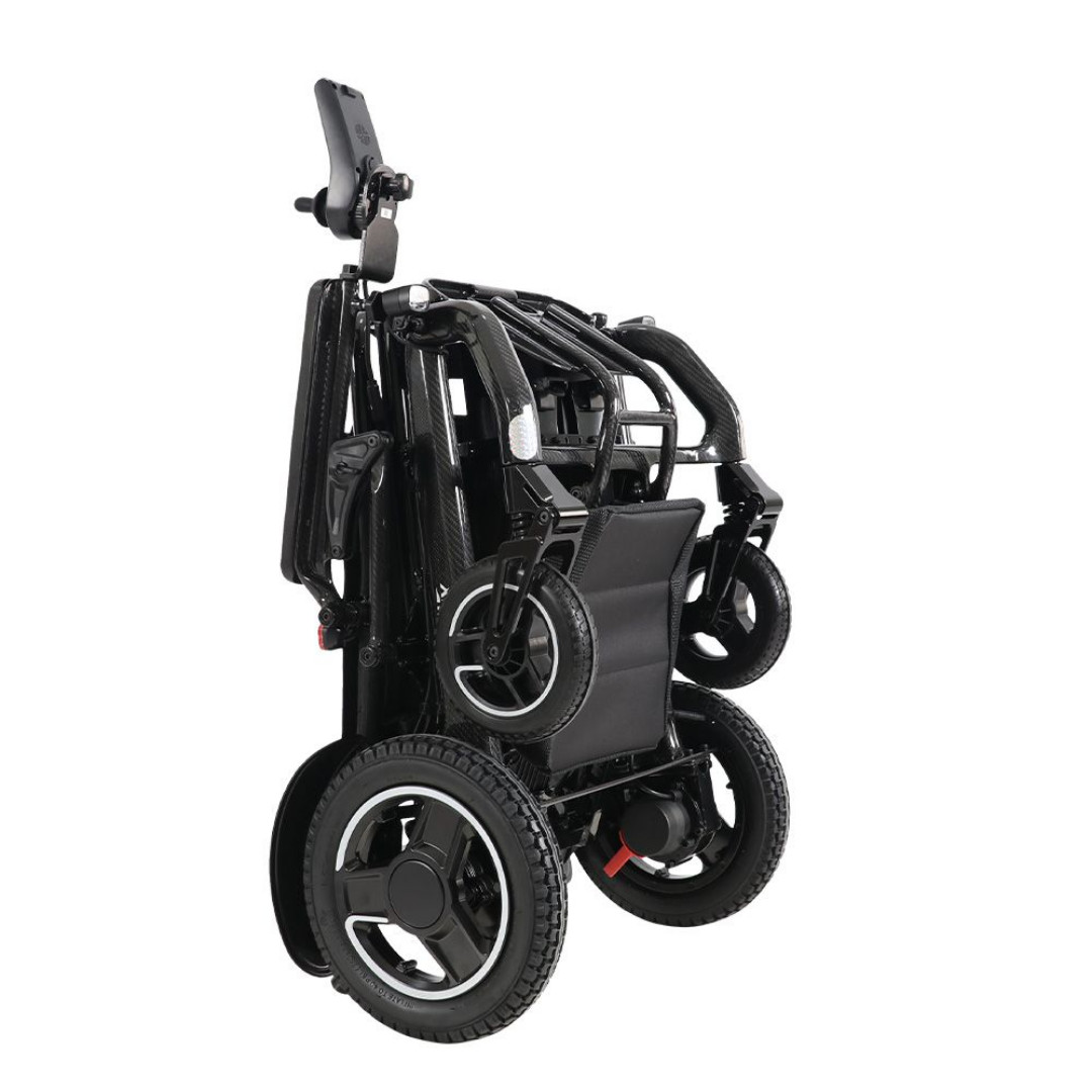 Die schwarze Carbon-Aluminium-Verbundkonstruktion wirkt sportlich und elegant zugleich. Mit nur 21,9 kg Eigengewicht (25,7 kg inkl. Akkus) zählt er zu den besonders leichten E-Rollstühlen seiner Klasse und lässt sich mit wenigen Handgriffen kompakt zusammenfalten.