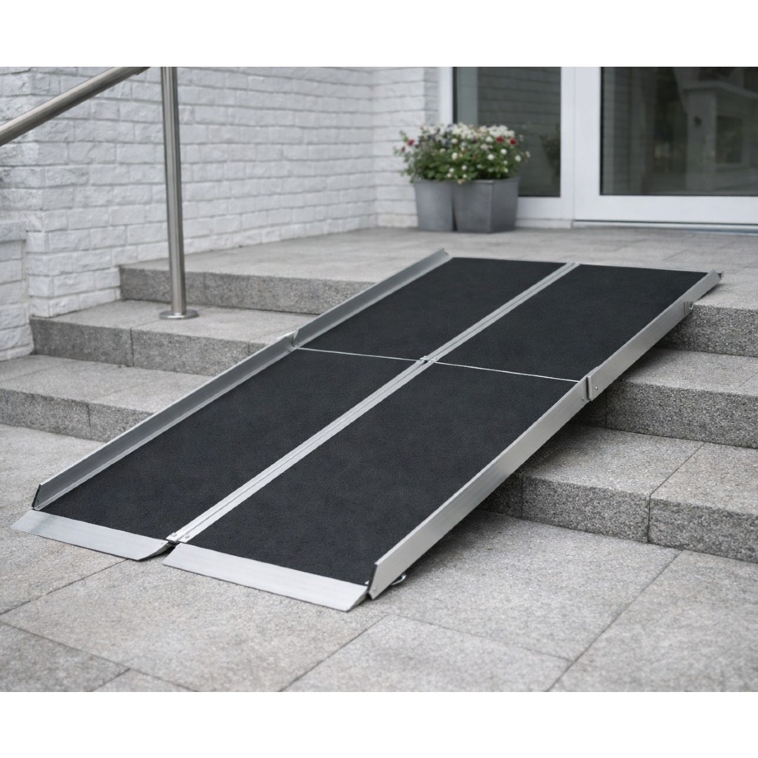 Aus Aluminium hergestellt und mit einem Friktionsbelag beschichtet. Längere Flachrampe, bestehend aus vier Rampenteilen, die sich wie ein Blatt Papier falten lassen. Die Rampen sind mit einem Tragegriff ausgestattet, um sie einfach transportieren zu können.